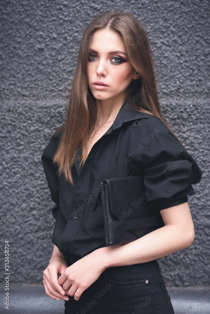 Beautiful girl in black clothes oversize with suspenders. Dark background. Toned image.