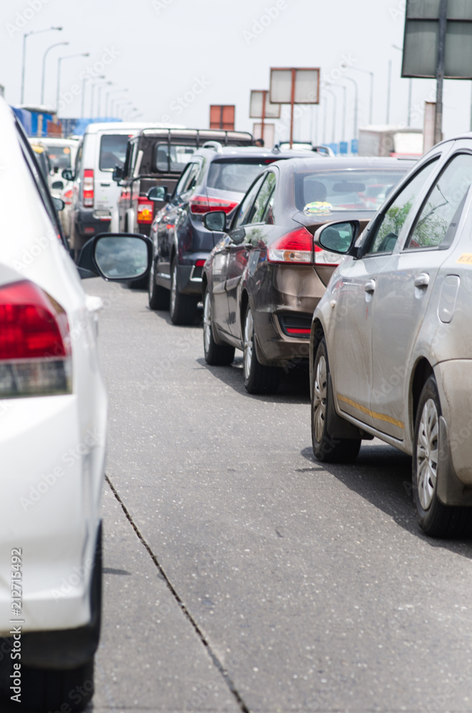 Cars on the road in traffic jam. Traffic situation in the Mumbai city. Pollution situation in India.