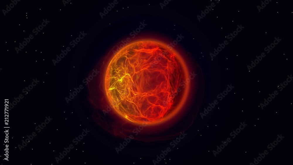 Fire planet in outer space. Burning sun with solar flares and energy charges. Rotating, ball beautiful tongues of fire and flame. Fire ball