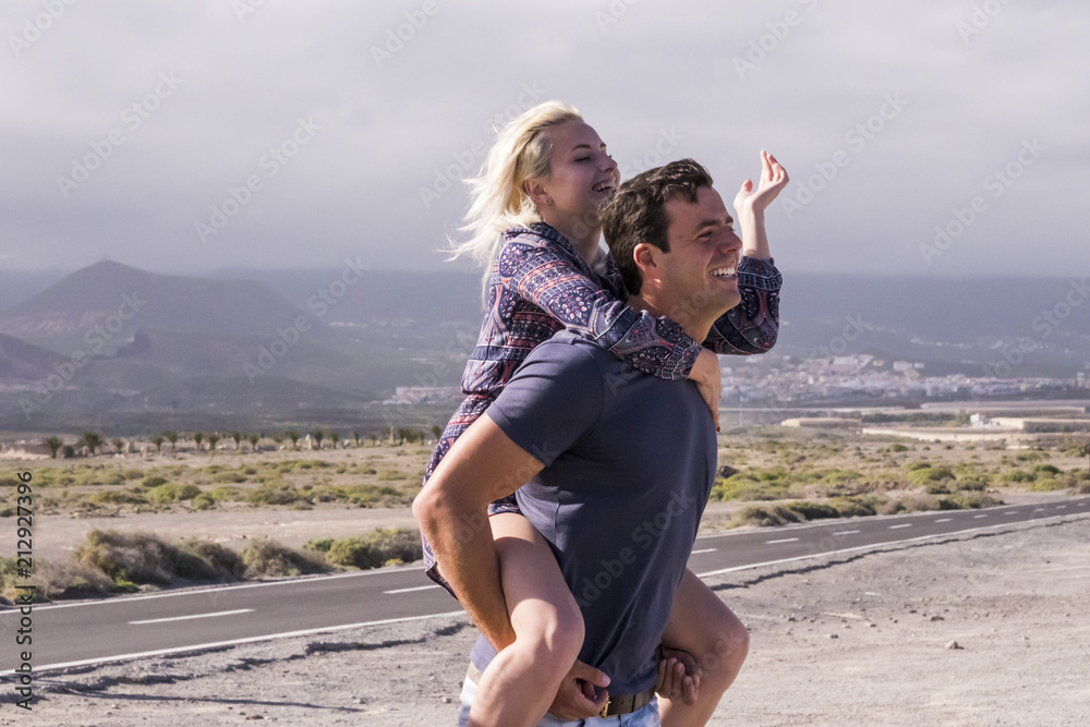 young happy couple enjoy outdoor time leisure activity together smiling and having fun and laughing. intimate playing together. desert and log road background for life forever and travel concept