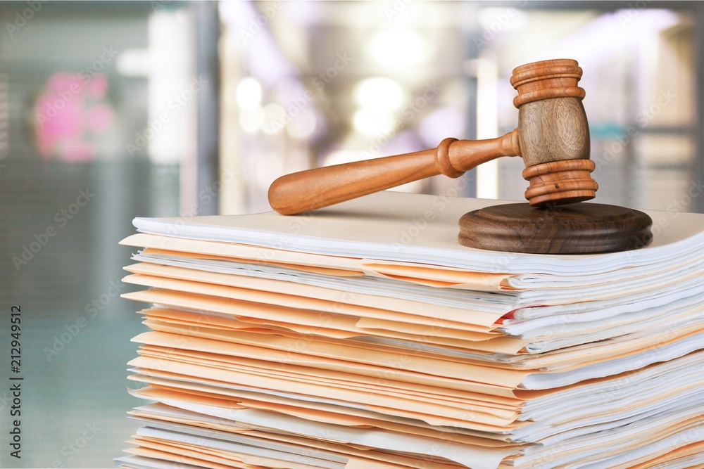 Judge hammer and documents on room background