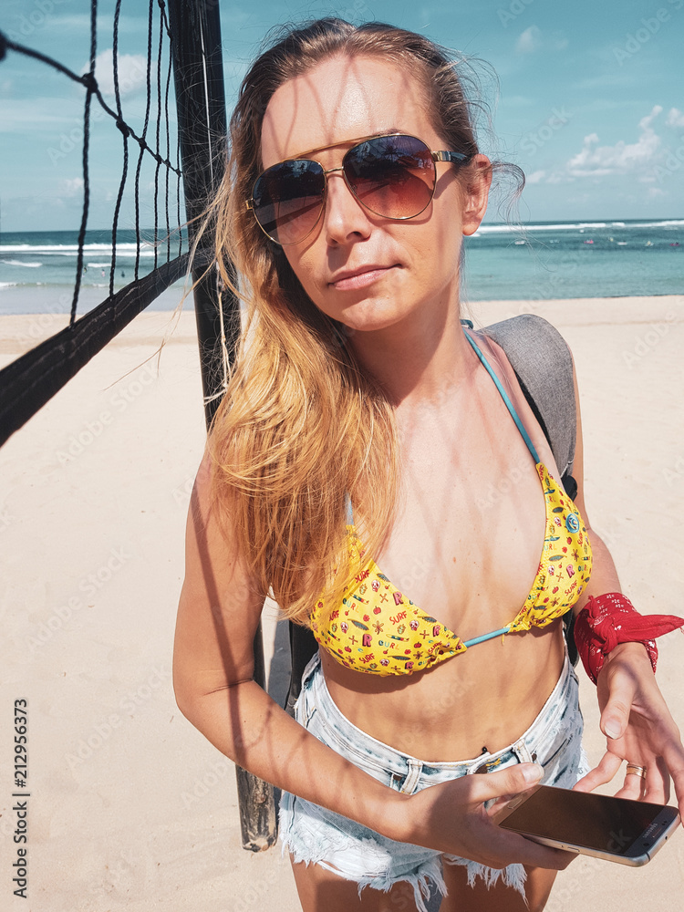 Portrait of pretty woman tourist standing on the sandy beach near volleyball net during hot summer day