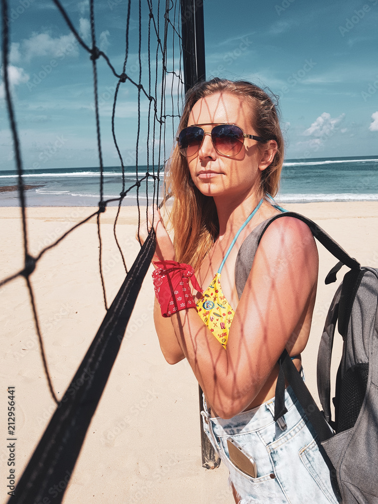 Portrait of pretty woman tourist standing on the sandy beach near volleyball net during hot summer day