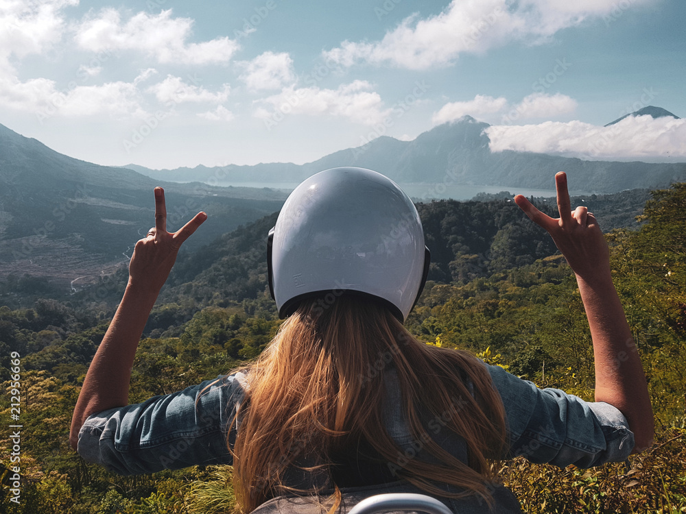 Back view of woman tourist in helmet admire beautiful view of Batur lake and Mount Agung in Bali, Indonesia