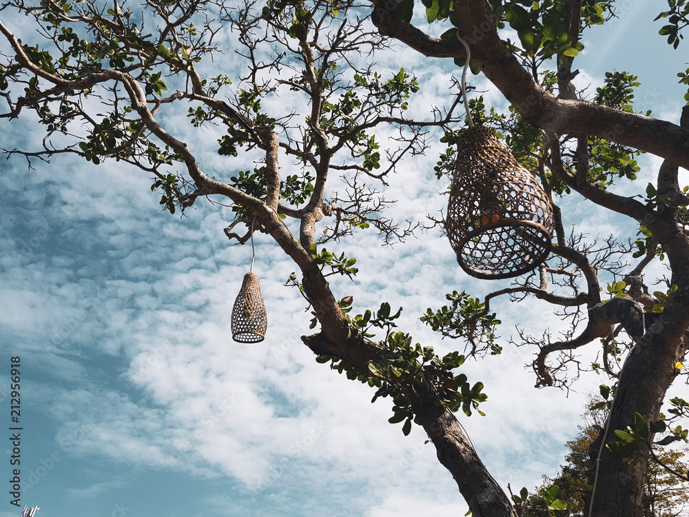 Coops lamps hanging decorations on the tree over blue summer sky background
