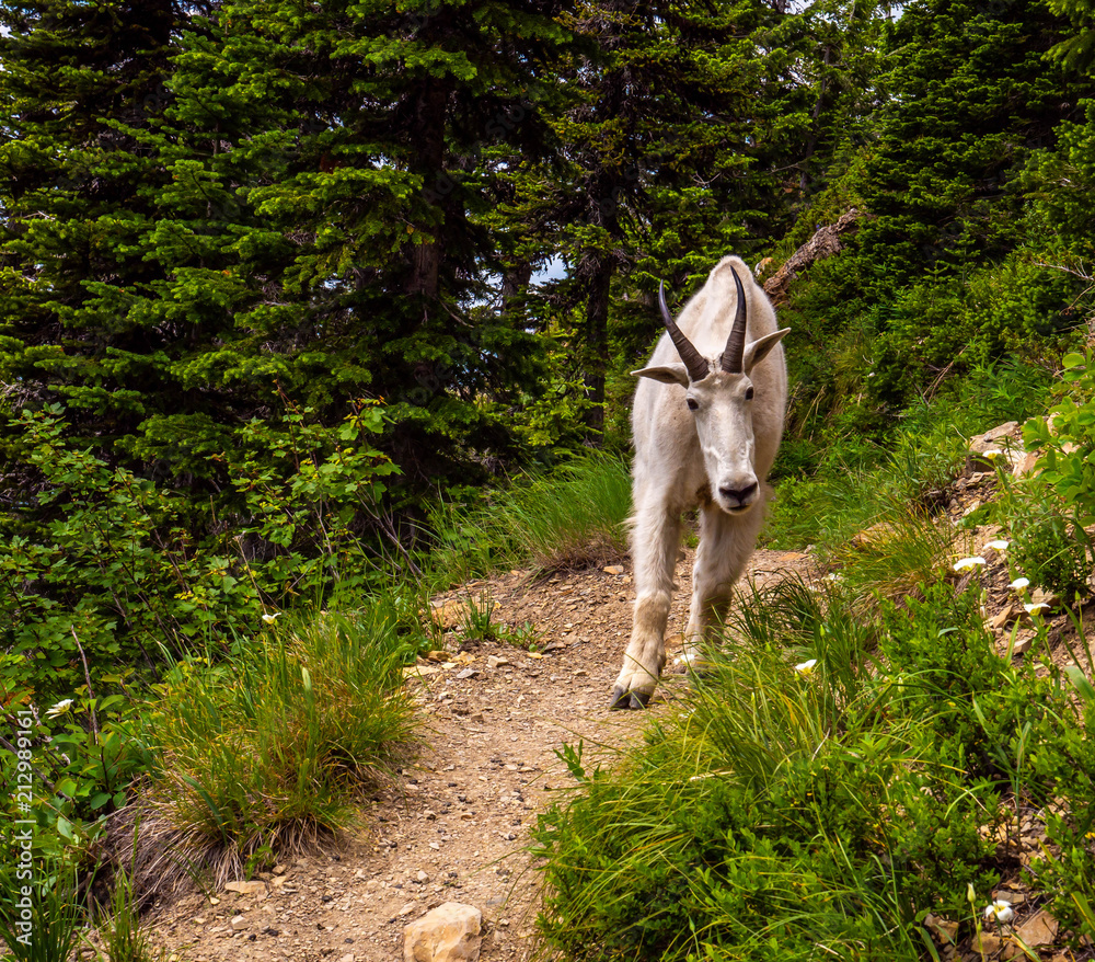 A female mountain goat (actually a member of the Antelope family) on the narrow Noisy Creek Notch Trail in the Jewell Basin in Montana is curious of the camera.
