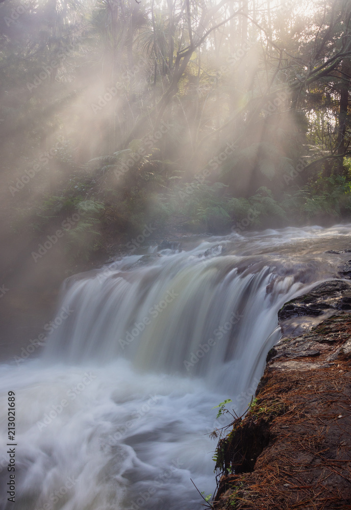 beautiful waterfall in rays of sunshine