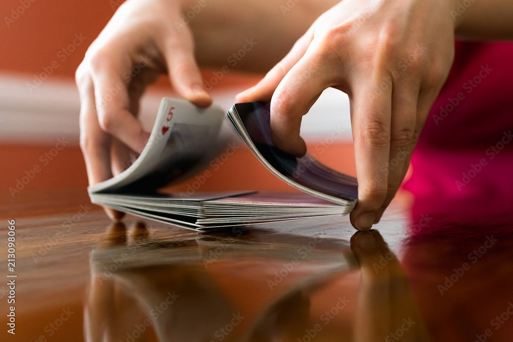 Person Shuffling a Deck of Cards on a Reflective Wooden Table