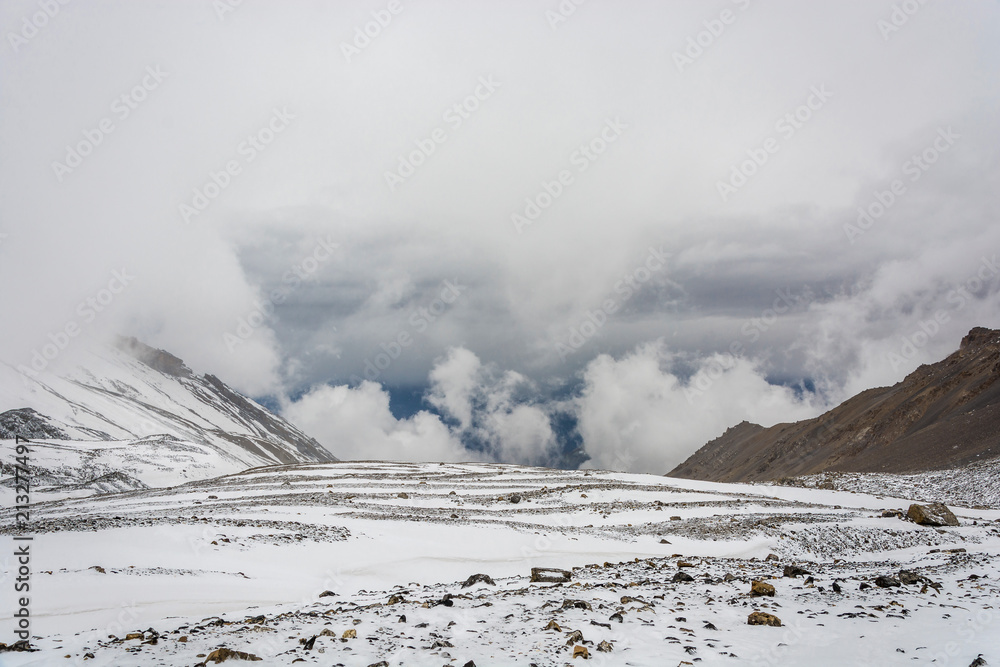 Mountain landscape on the snow-covered Thorong La pass, Nepal.