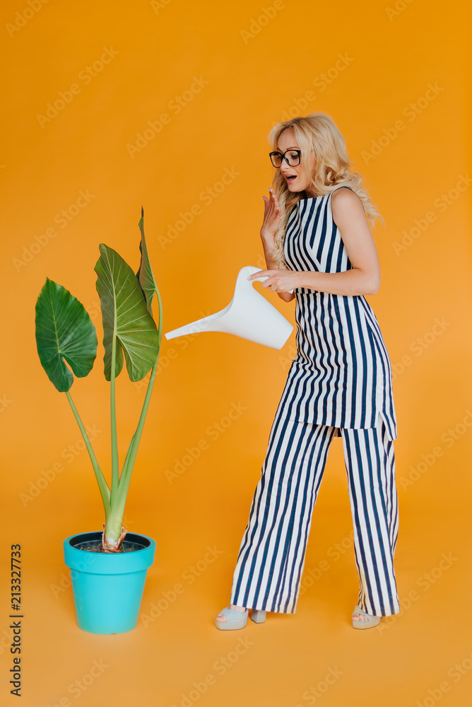 business lady dressed in suit.female with red lips and glasses.Care for plants