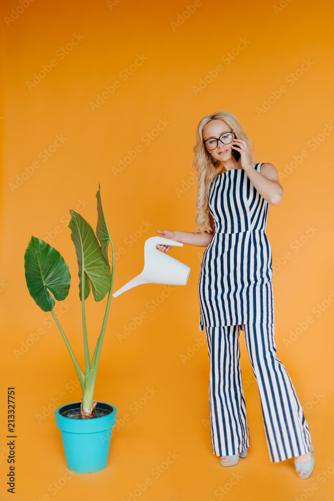 business lady dressed in suit.female with red lips and glasses.Care for plants