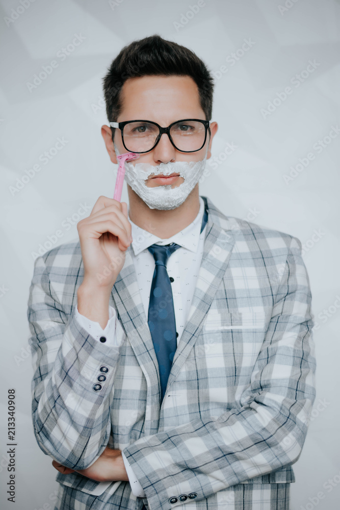 Macho in formal suit cuts and shaves beard and moustache