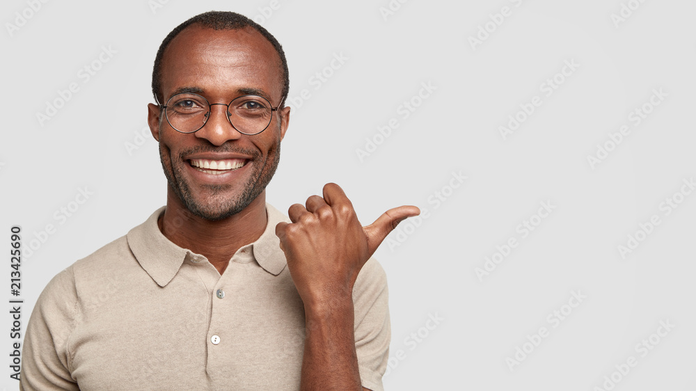 Indoor shot of pleasant looking dark skinned male with cheerful expression, points aside with thumb, has broad smile, advertises something, isolated on white background. Handsome African American man
