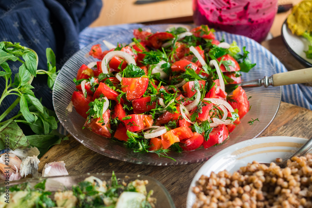 Healthy raw vegetables salad with tomatoes, onion rings, green herbs and spices garnished with spices and unrefined sunflower oil. Raw vegan vegetarian paleo food diet
