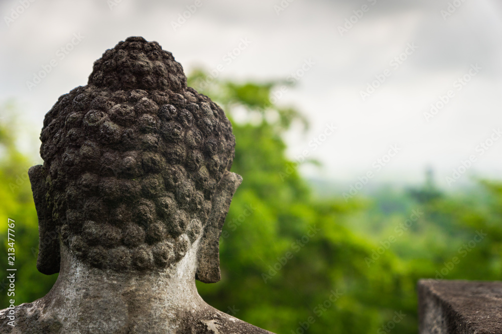 The back of the head of a Buddha statue looking out over Borobudur Temple in Indonesia.