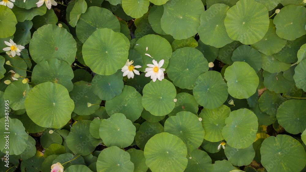 Stunning Aerial Drone Stock Photography of Flowering of lotuses on the lake near the road. Lotus Komarova in Krasnodar Krai of Russia. Flowering Of Lotus On The Lake.