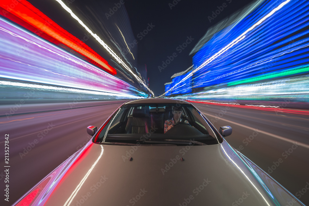 View from Front of Car moving in a night city, Blured road with lights with car on high speed.