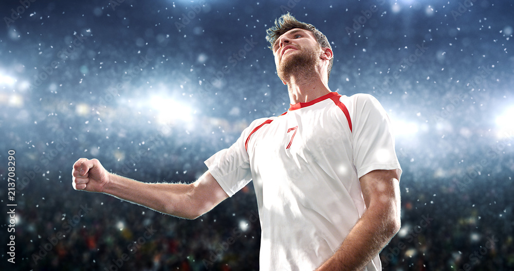 Soccer player celebrates a victory on the professional stadium while it’s snowing.
