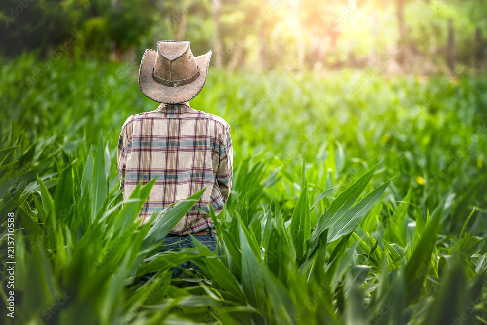 Young farmer standing in corn fields with beautiful sunset.