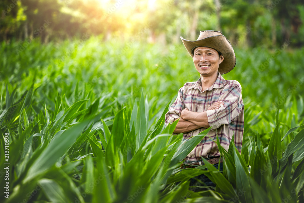 Young farmer standing and smiling in corn fields with beautiful sunset.