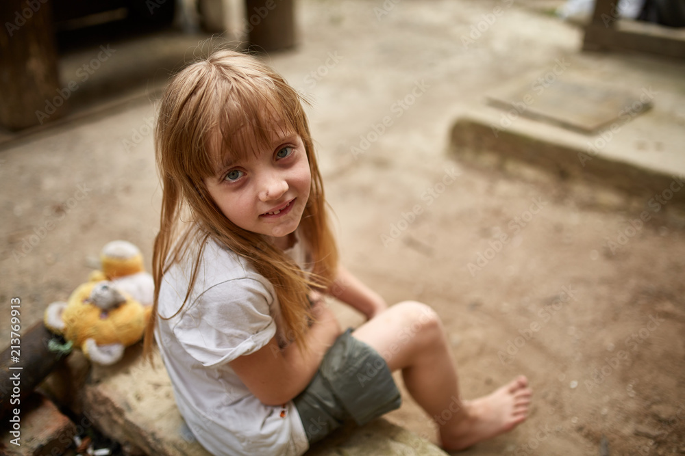 Poor abandon little girl with bare feet sitting in the alley, view from above
