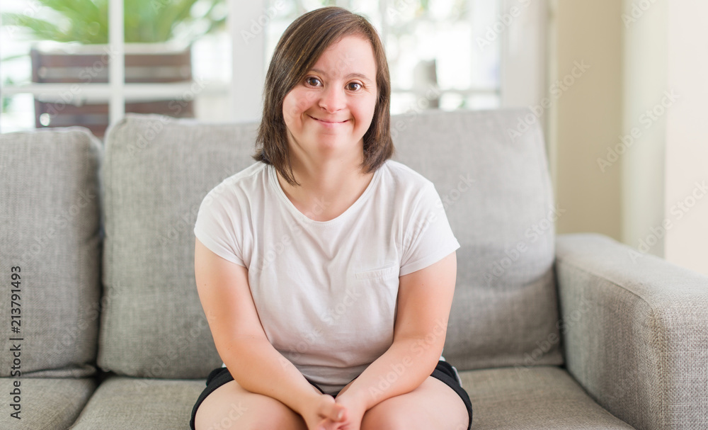 Down syndrome woman sitting on the sofa at home with a happy face standing and smiling with a confident smile showing teeth