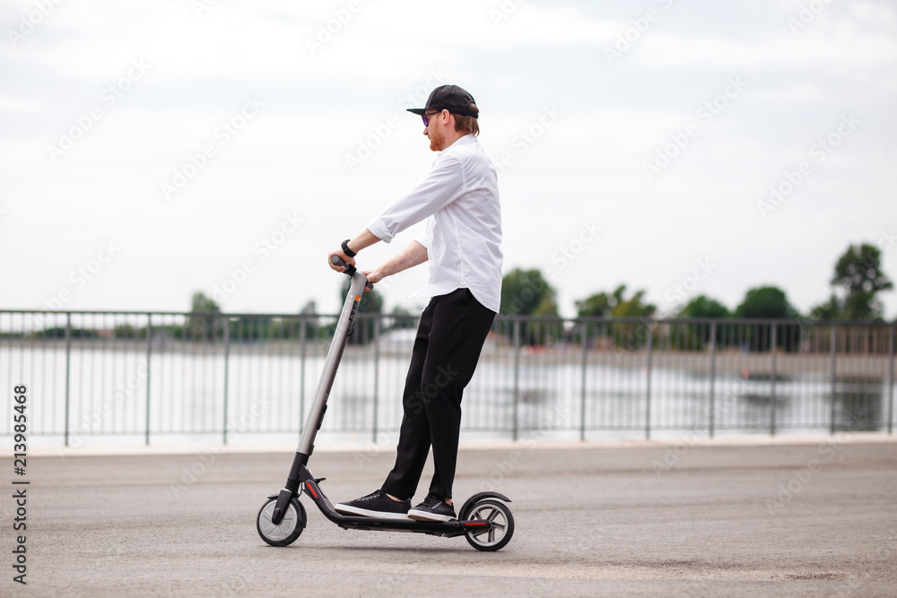 Modern man in stylish black and white outfit riding electric scooter in the city