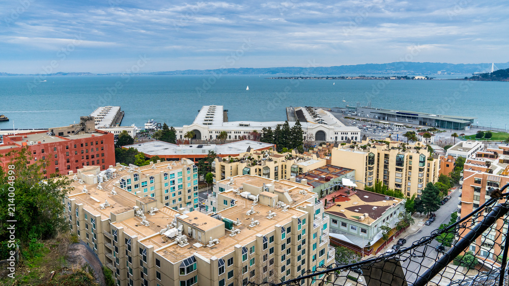 San Francisco Pier. View from above. Beautiful blue sky and boats sailing in the ocean in the background.