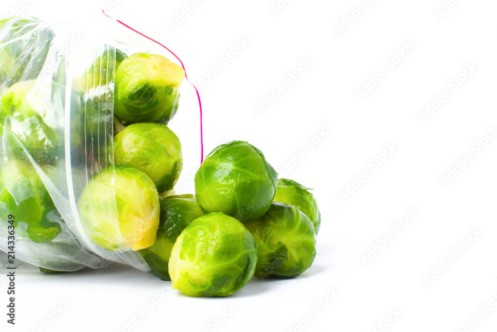 Plastic bag with frozen brussel sprouts isolated on white. Vegetable preservation