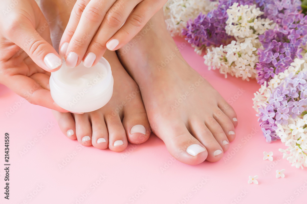 Young woman's hands applying perfect groomed feet with moisturizing natural cream. Care about clean, soft, smooth skin. Beautiful branches of colorful lilac. Fresh flowers on pastel pink background.