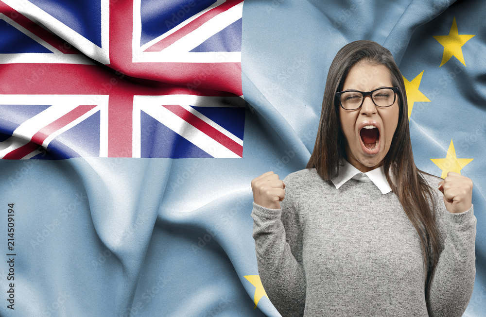 Ecstatic woman holidng fists and screaming against flag of Tuvalu