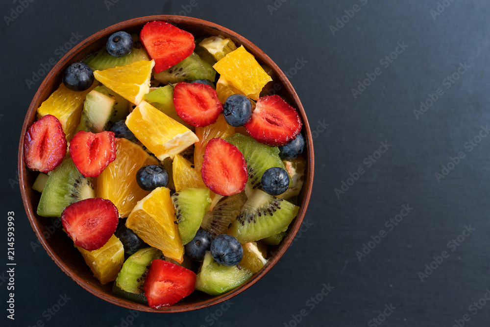 Bowl of healthy fresh fruit salad on dark background. Top view.