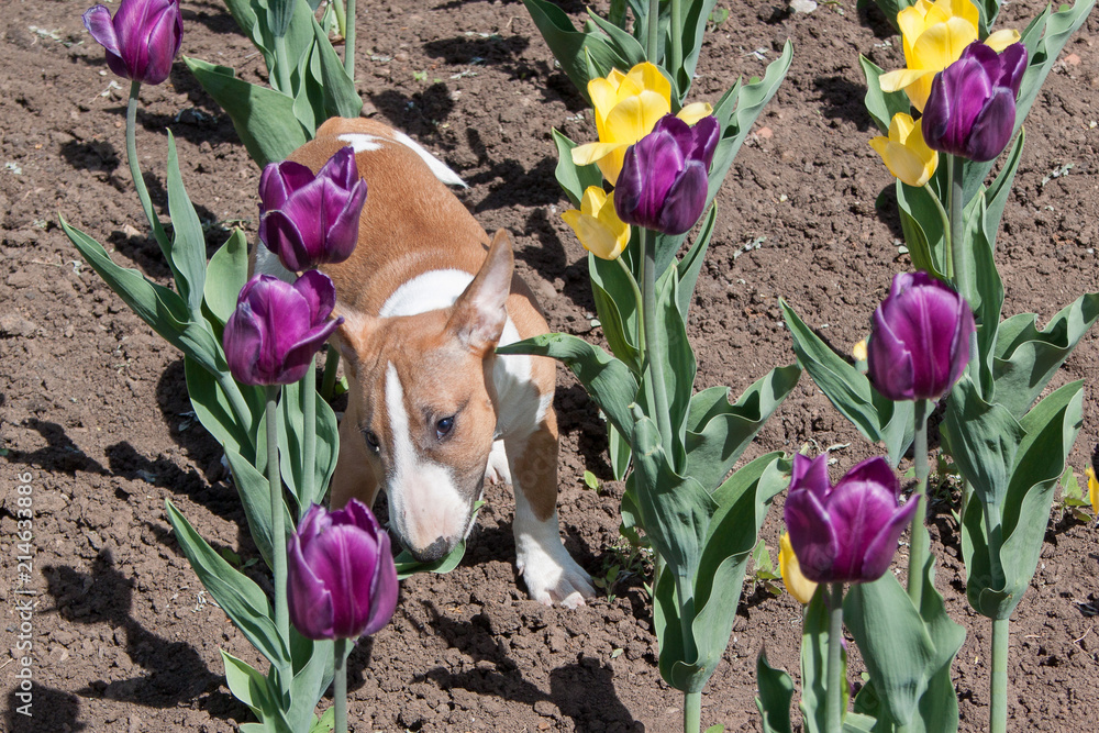 Cute miniature bull terrier is playing on the field with tulips. Pet animals.