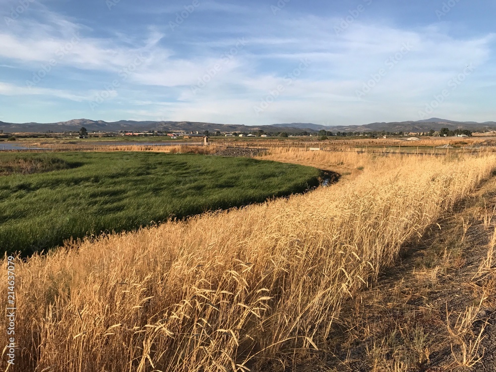 Golden evening light falls upon the Crooked River Wetlands outside of Prineville in in Central Oregon on a pleasant fall day.