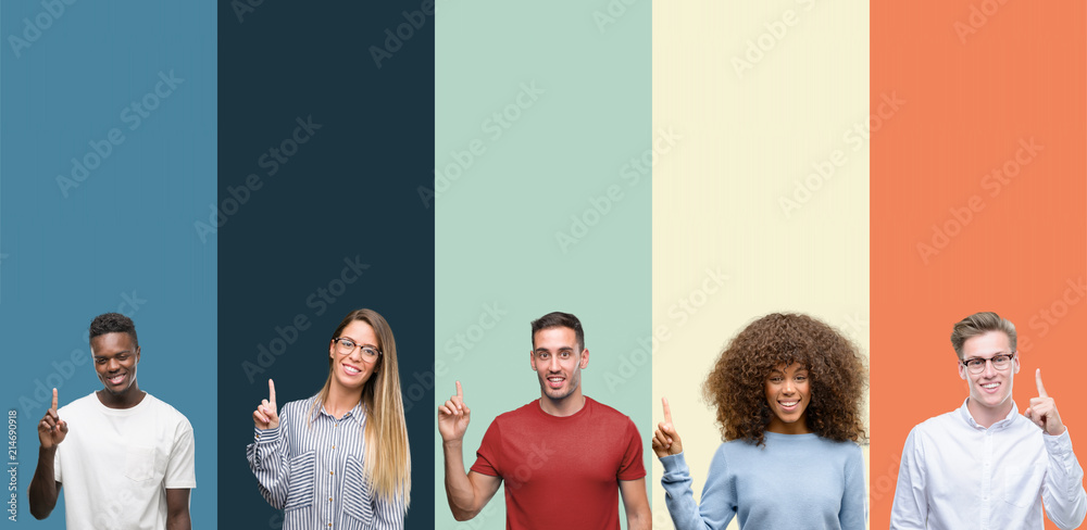 Group of people over vintage colors background showing and pointing up with finger number one while smiling confident and happy.