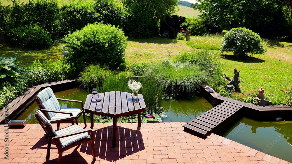 attraktiver naturbelassener Teich an rote Terrasse angrenzend mit Brücke und Tisch und Stühlen