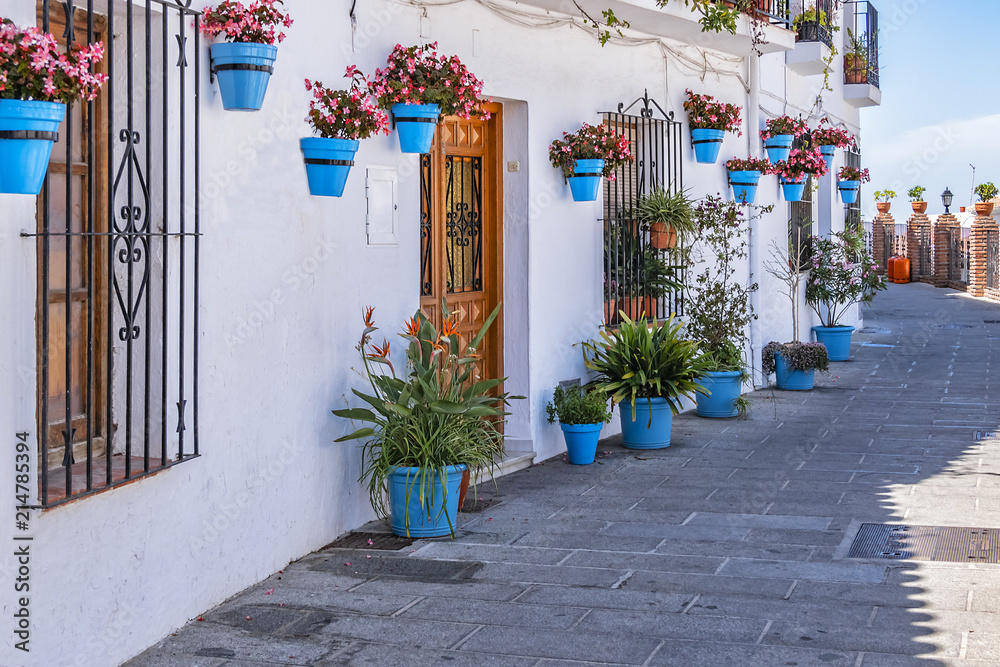 Beautiful view of old Mijas Calle Moro (Moro Street). Mijas (not far from Malaga) - Spanish hill town overlooking the Costa del Sol, known for its white-washed buildings. Mijas, Andalusia, Spain.