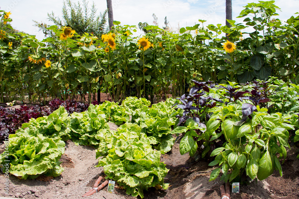 Growing rows of organic basil, lettuce, red lettuce and sunflowers. Organic home gardens