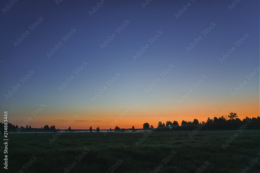 Orange dawn over the field with fog in summer