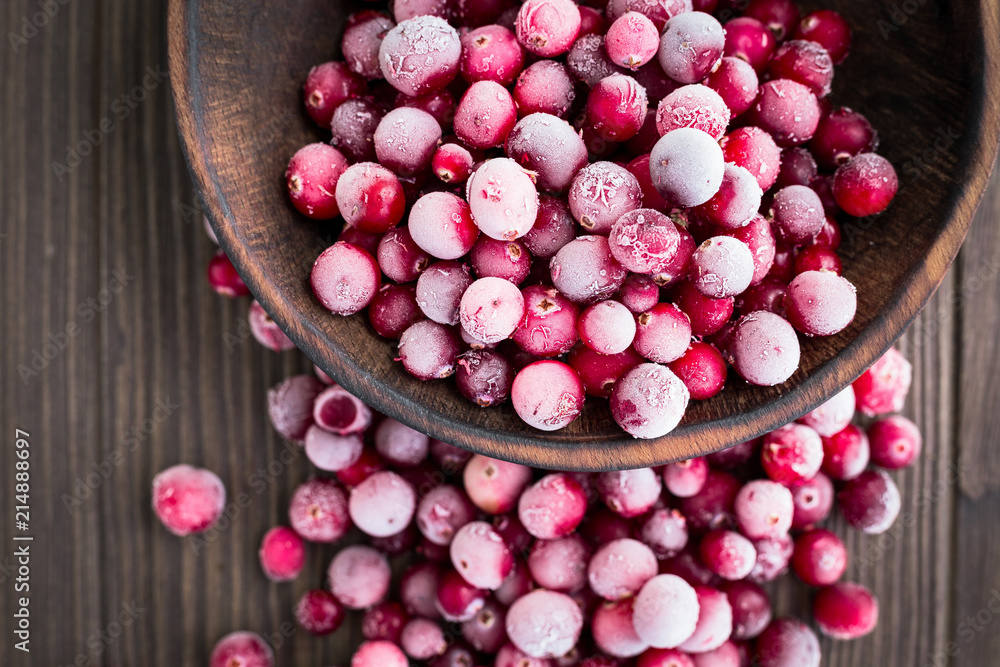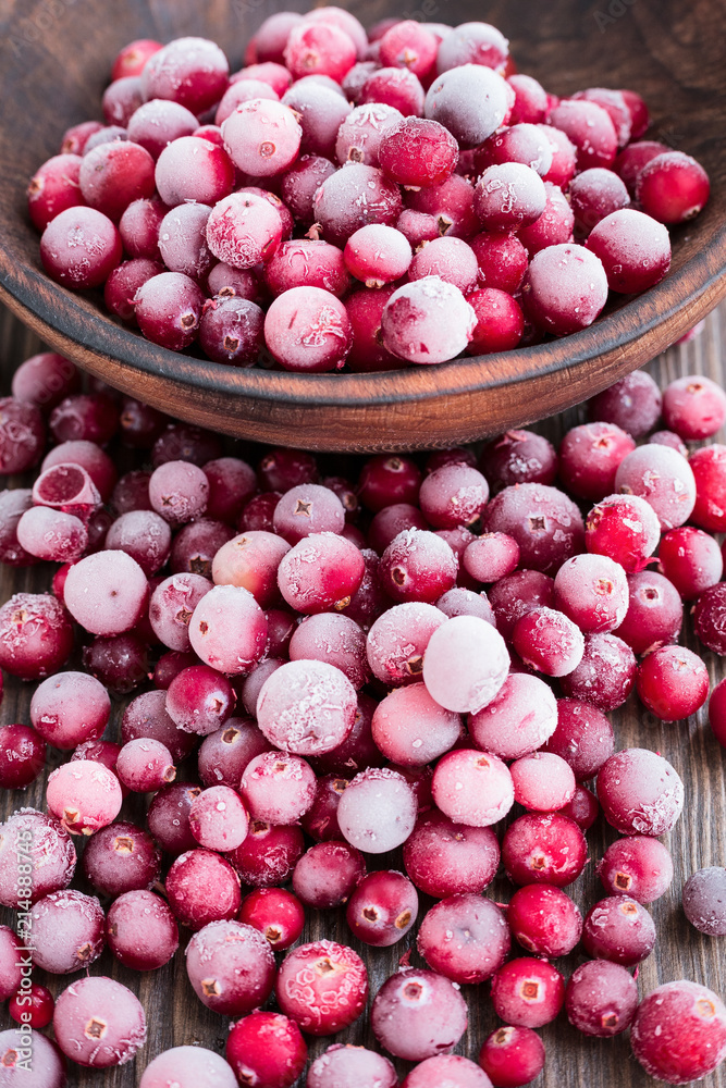 Frozen Cranberries in a wooden Bowl on Wooden Background