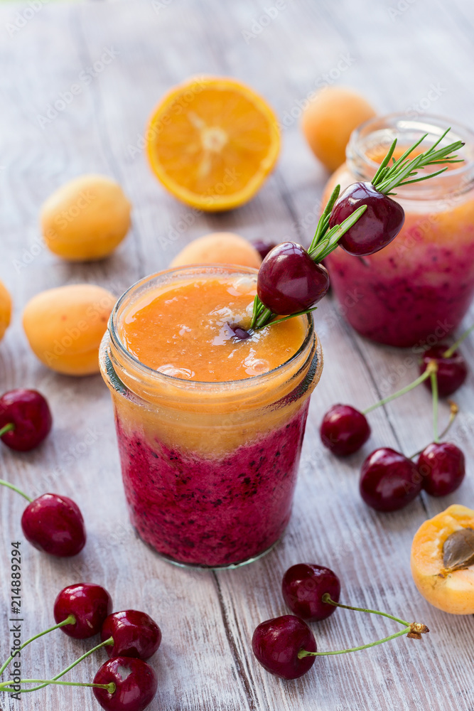 Smoothie in a jar with fresh black cherries and apricots. White wood background. Flat lay