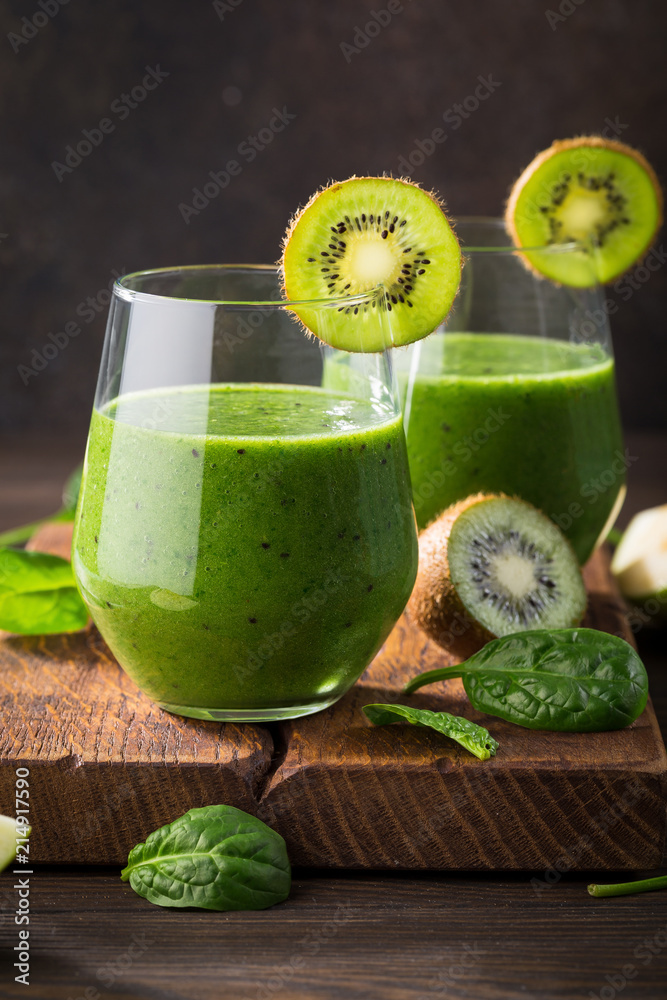 Healthy green smoothie with spinach, kiwi and apple juice in glasses