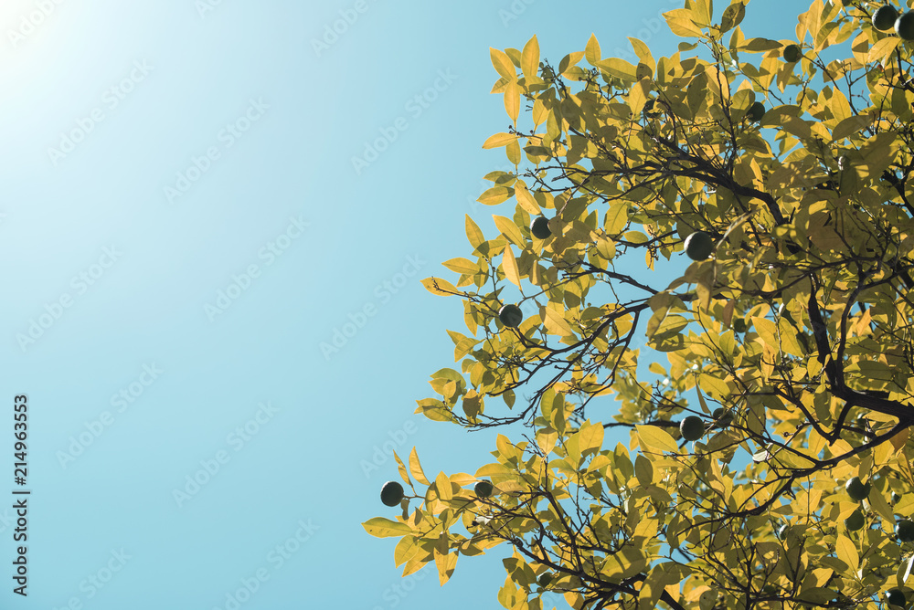 Detalle contrapicado de ramas de árboles en contraluz bajo un cielo azul intenso. Ramas con hojas verdes y fruto verde sin madurar.