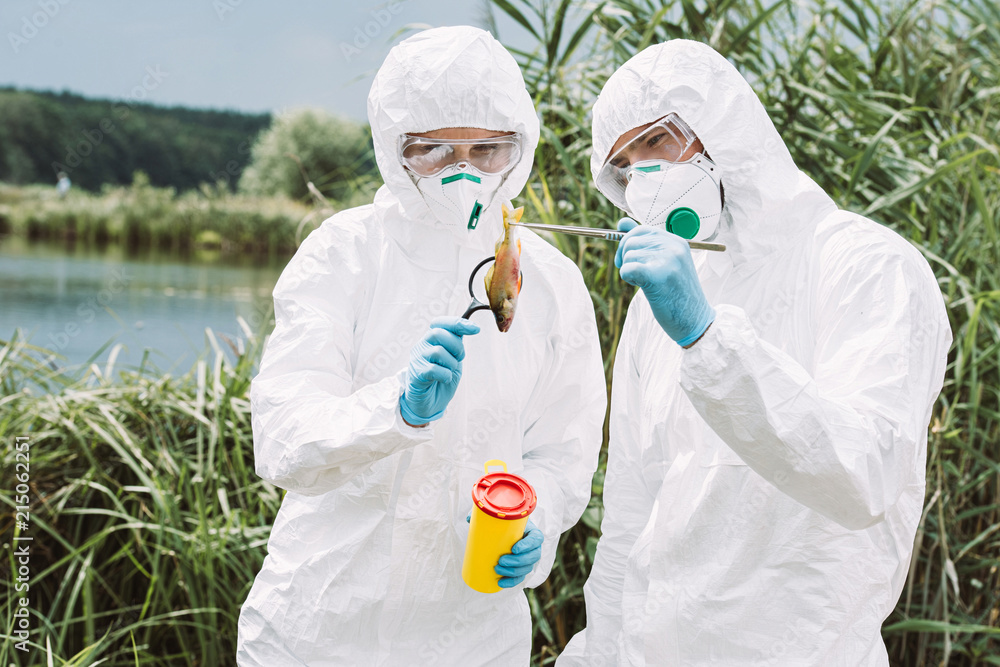 male scientist in protective mask and suit holding fish by tweezers while his colleague examining it by magnifier near river