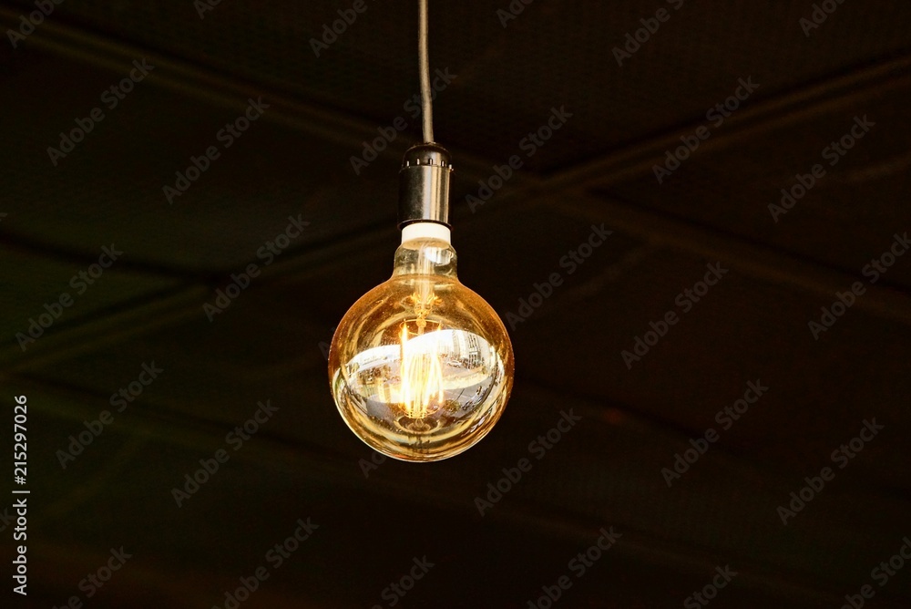 large luminous round light bulb on a cord in a dark room