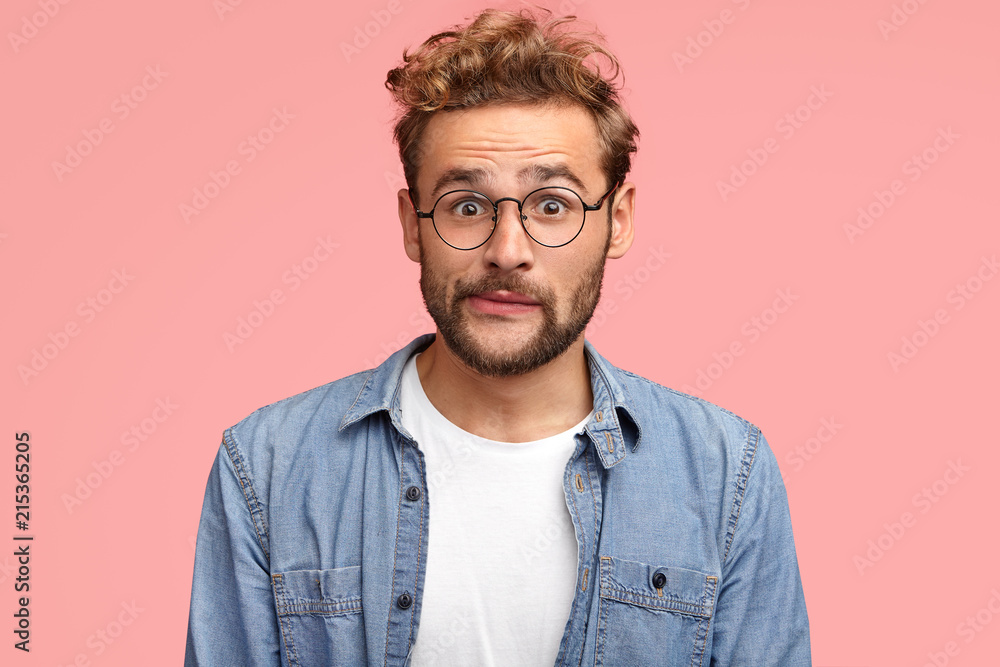 Thrilled curly hipster with puzzled expression purses lips and looks with stunned expression, wears denim shirt, has stubble, isolated over pink background. People, reaction and lifestyle concept