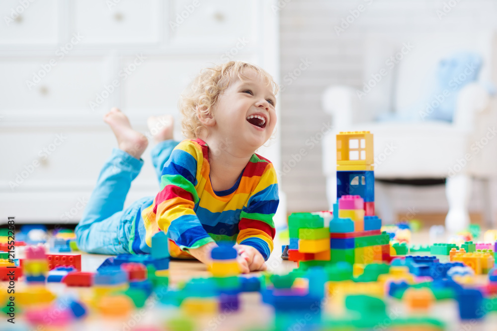 Child playing with toy blocks. Toys for kids.