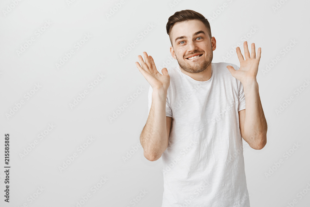 Guy not participate in it, pass. Relaxed careless handsome young man with beard and stylish hairstyle in white casual shirt raising palms in surrender and smiling happy to be uninvolved and unaware