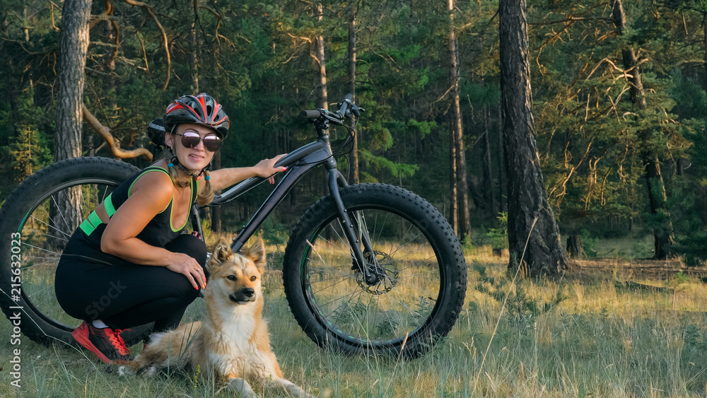 Fat bike also called fatbike or fat-tire bike in summer riding in the forest. Beautiful girl and her bicycle in the forest. She met the dog in the woods and stroked her. The dog is very kind and good.