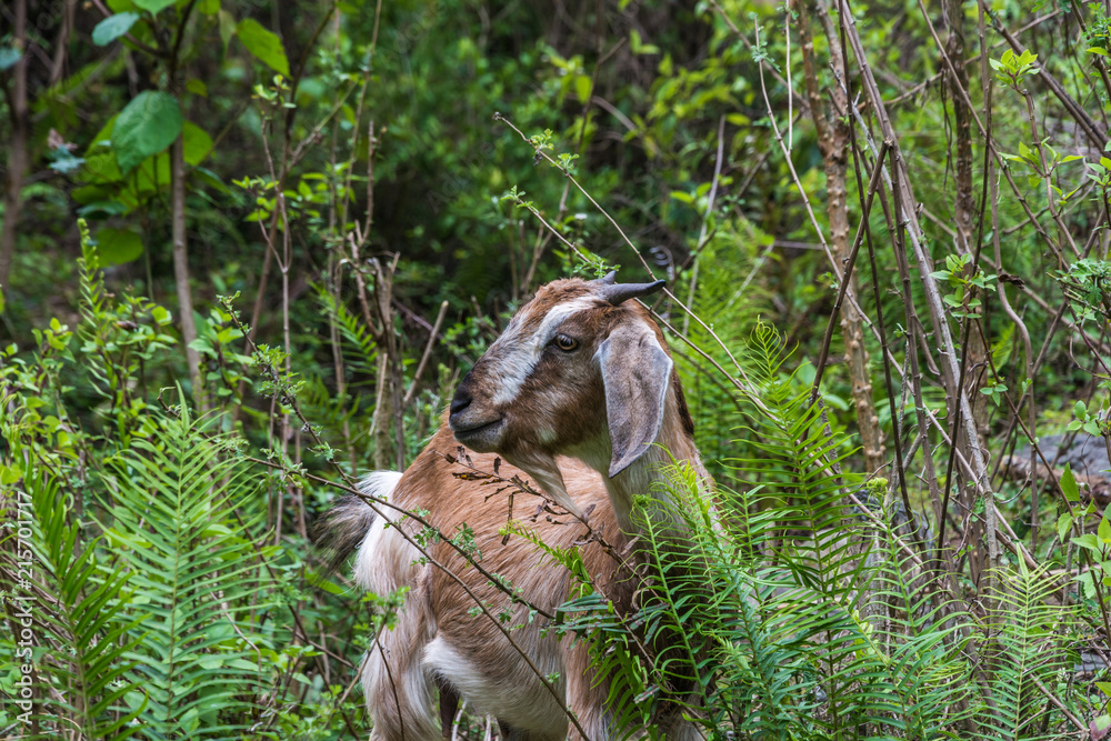 A young goat in green thickets.